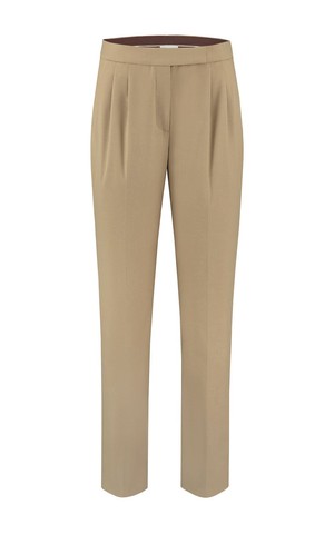 The Liv double pleated pants is designed to sit high on the waist. These full-length trousers are styled with tapered legs and creases at both front and back. The extra-wide hem makes it easy to turn them up. Features two welt pockets at the back, two slanted side pockets, and hook-and-bar closure. Can be combined with the Lois blazer to create a suit.