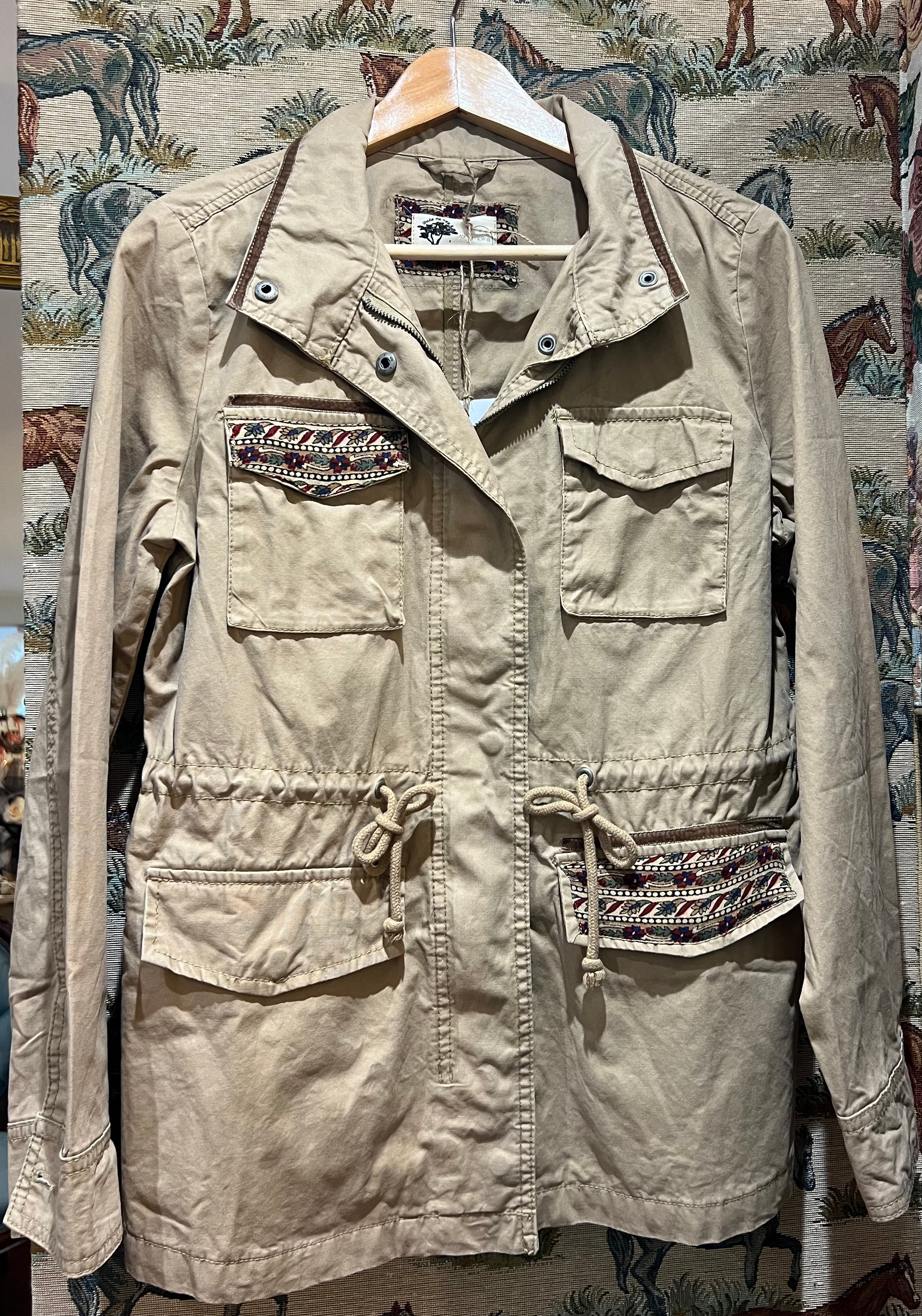 Preloved utility jacket laundered, repaired decorated by hand with re used textiles and trims. Each piece is unique.