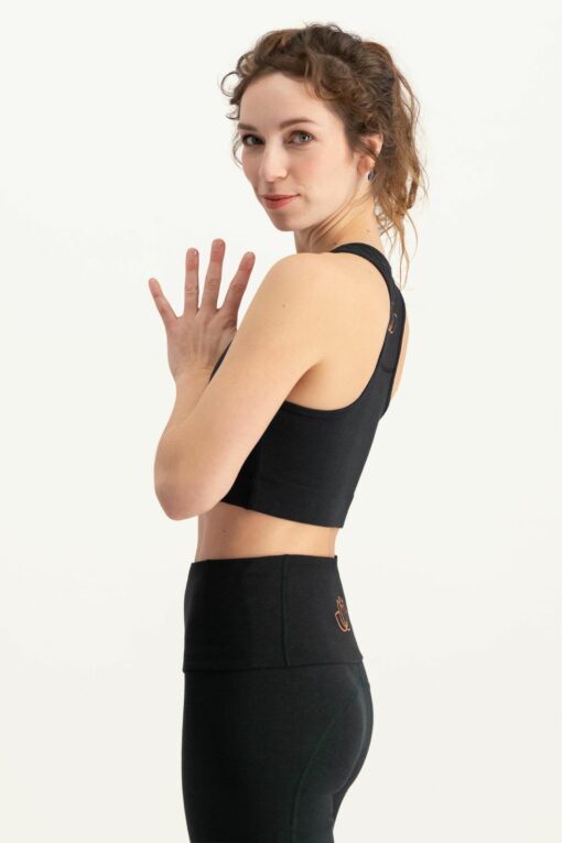 The yoga sports bra Surya is an essential yoga basic. This sturdy, functional yoga bra top can be worn as a (sports) bra or simply as a yoga top. Perfect for intense, dynamic forms of yoga such as Hot yoga, Ashtanga or Power yoga. But you can also wear it comfortably for all forms of yoga or other types of low- to medium-impact workout.