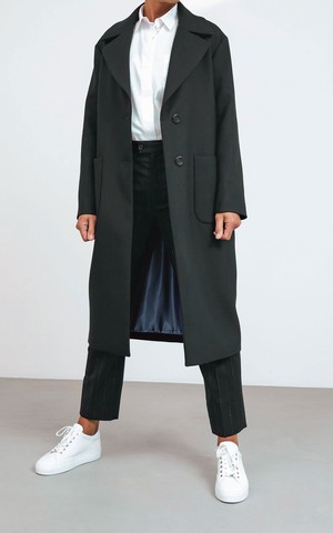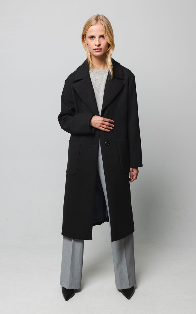 The classic New York coat is designed with an oversized fit and dropped shoulders. This coat with notch collar is an ageless and timeless choice. It has a straight silhouette with a two button closure. This longer coat has a mid-calf length and features two front patch pockets. Beautifull but fragile material. Be carefull with sharp items.