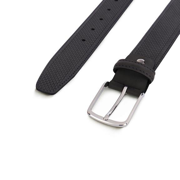 Jorba Grey: solid print belt with a geometrical tile pattern, a buckle clasp and a tappered tip made from vegan nobuk.