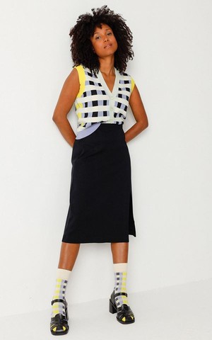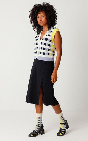 GOTS certified organic cotton jacquard vest. Short fit and V neck with a front buttoned fastening. Multicoloured jacquard.