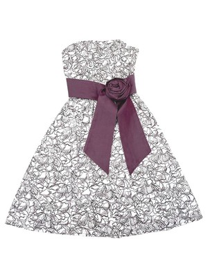 Our floral printed Hope Prom Dress is made from organic cotton that has been hand block printed by artisans in India, using eco-friendly dyes. The linear floral print is grey and mauve, and the dress features a contrast mauve removable waist sash and large corsage. Its strapless prom shape is a timeless silhouette, accentuating the waist. The fitted bodice is boned for extra support and the dress is fastened by a concealed side zip.