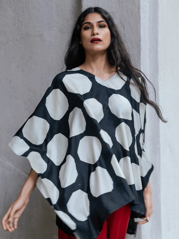 This elegant black white Kimono style top in 100% Natural Eri Peace silk, is inspired by Japanese art. A black body with bold white asymmetric polkas. These kimonos tops have a fluid silhouette and can be used as an overdress or as a blouse. It can be paired over trousers or even worn as a dress. They hang loose with drop shoulders and wide sleeves. The side slits making it an extremely comfortable wear. Slow fashion at its best these are suitable as formals, and easily converts your day look to an evening wear