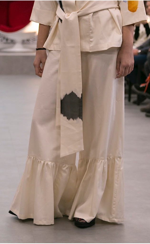 An expression of optimism inspired by flamenco dresses. Straight trousers with a ruffle below the knee in ivory color.