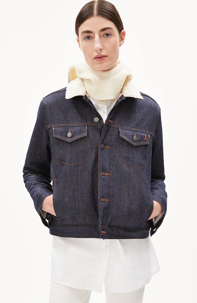 Totally on trend is this lined denim jacket from ARMEDANGELS. The jacket has a dark blue denim color (unbleached) and lovely soft teddy lining in off-white. Perfect as a in-between jacket or as a cardigan when it is really winter.