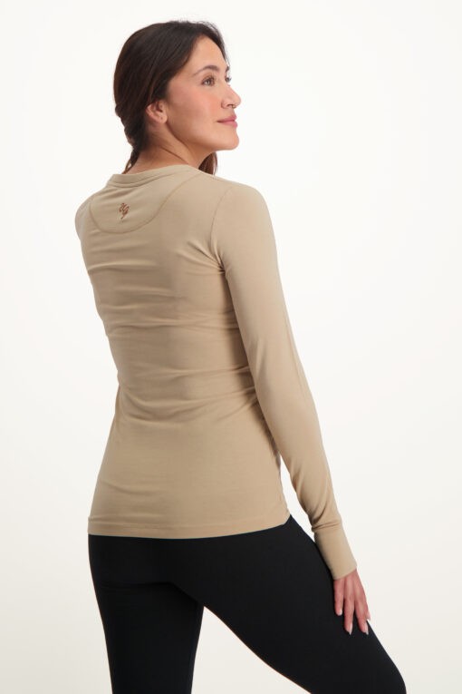 The Karuna OM longsleeve yoga shirt is a long yoga top for women. This yoga top fits nicely and is made of a dry-fit fabric. The fabric-mix of organic cotton, sustainable bamboo and lycra provides breathable fabric that stretches in any yoga pose.