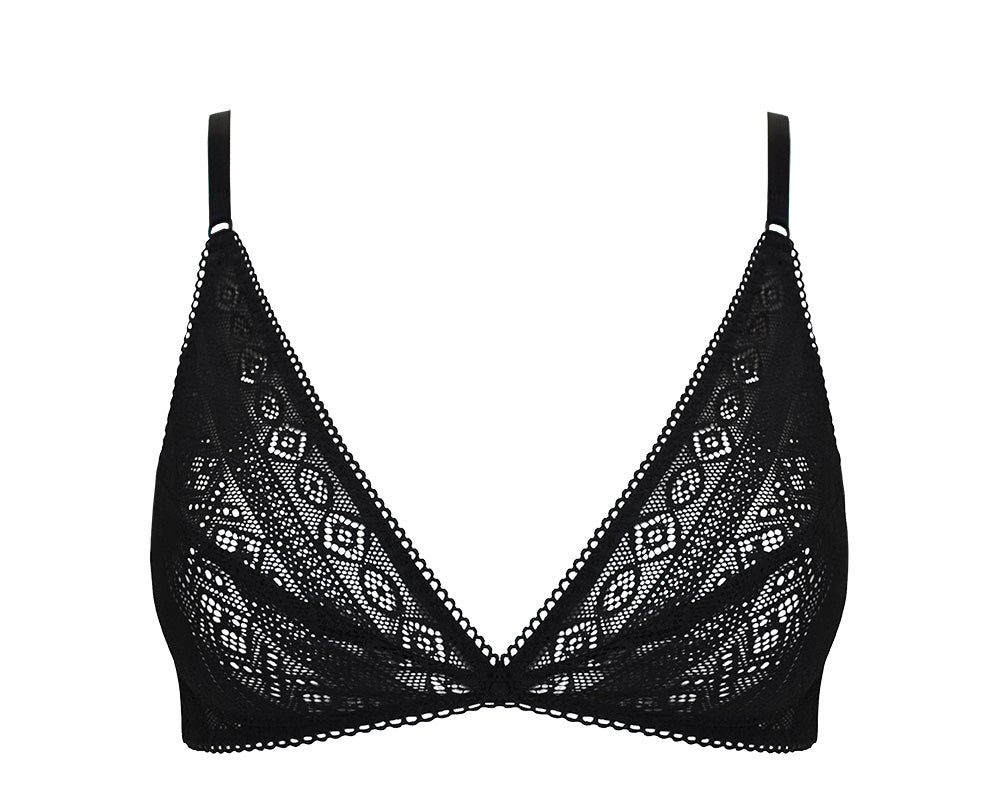 Our popular Darling bra designed in a geometrical lace that reveal just the right amount of skin. The light lace is soft and comfortable and with no padding or wire the stretch forms to the body enhancing your natural shape. This version has tall front cups that touch high over the décolletage, it has adjustable shoulder straps and closes with an adjustable back clasp.