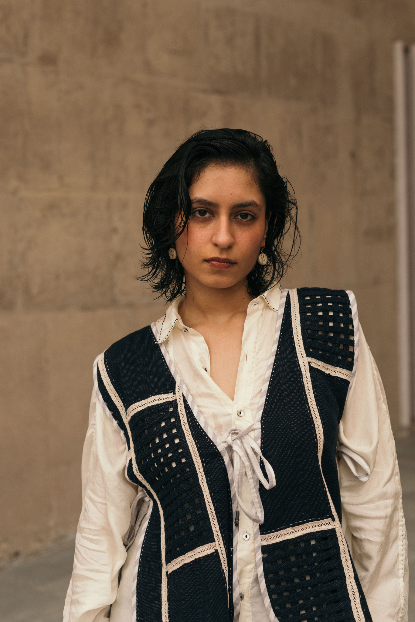 Made from 100% cotton fibres and natural materials, The Grid Bib is crafted in azo-free dyed, handwoven black cotton. Strips of fabric are pieced together to form a subtle grid-like structure, intersected with panels joined using delicate lace inserts. The surface is detailed with hand-done Kantha embroidery, creating soft textural depth.