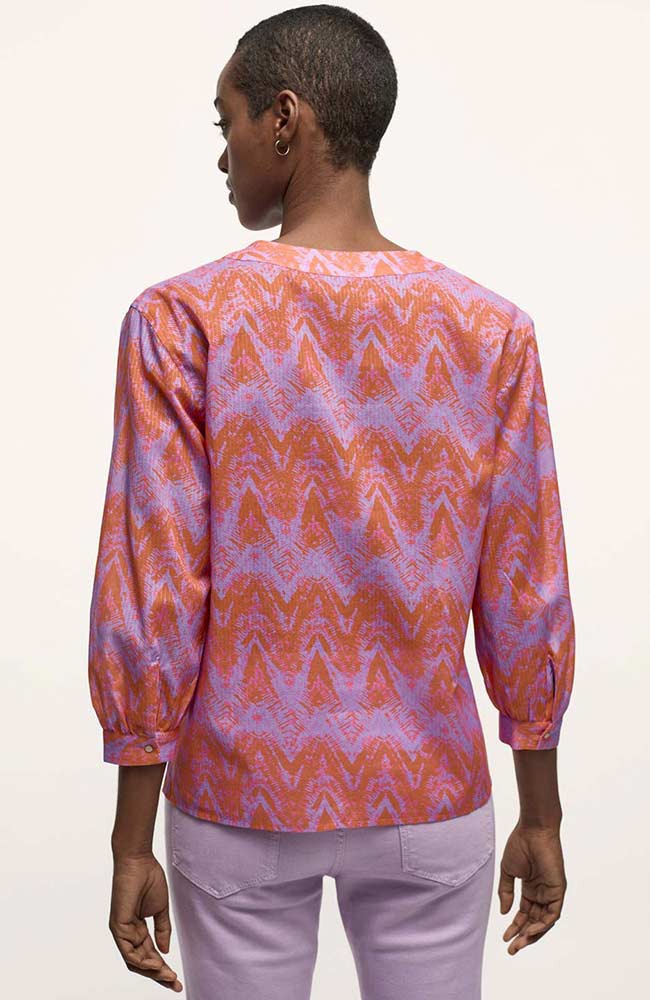 Beautiful summer blouse in lilac with coral red and an abstract print from our new brand LANIUS. It features a V-neckline, straight fit and 5/6 sleeves with small cuffs. Made of organic cotton. The color is best seen in the 1st photo: bright orange/red with lilac purple.